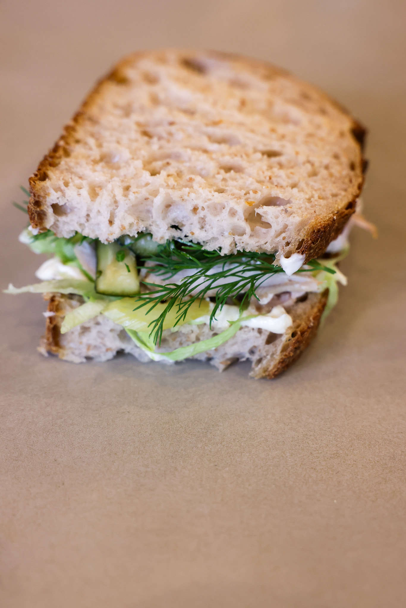Kanapka z naszego klasyka (chleb pszenny na zakwasie, składniki: mąka pszenna (pszenica), woda, sól), Indyk pieczony, majo chrzanowe, piklowany ogórek z koperkiem, kompresowany seler naciowy, sałata lodowa, swieży chrzan. Produkt zawiera gluten i może zawierać orzechy i sezam.