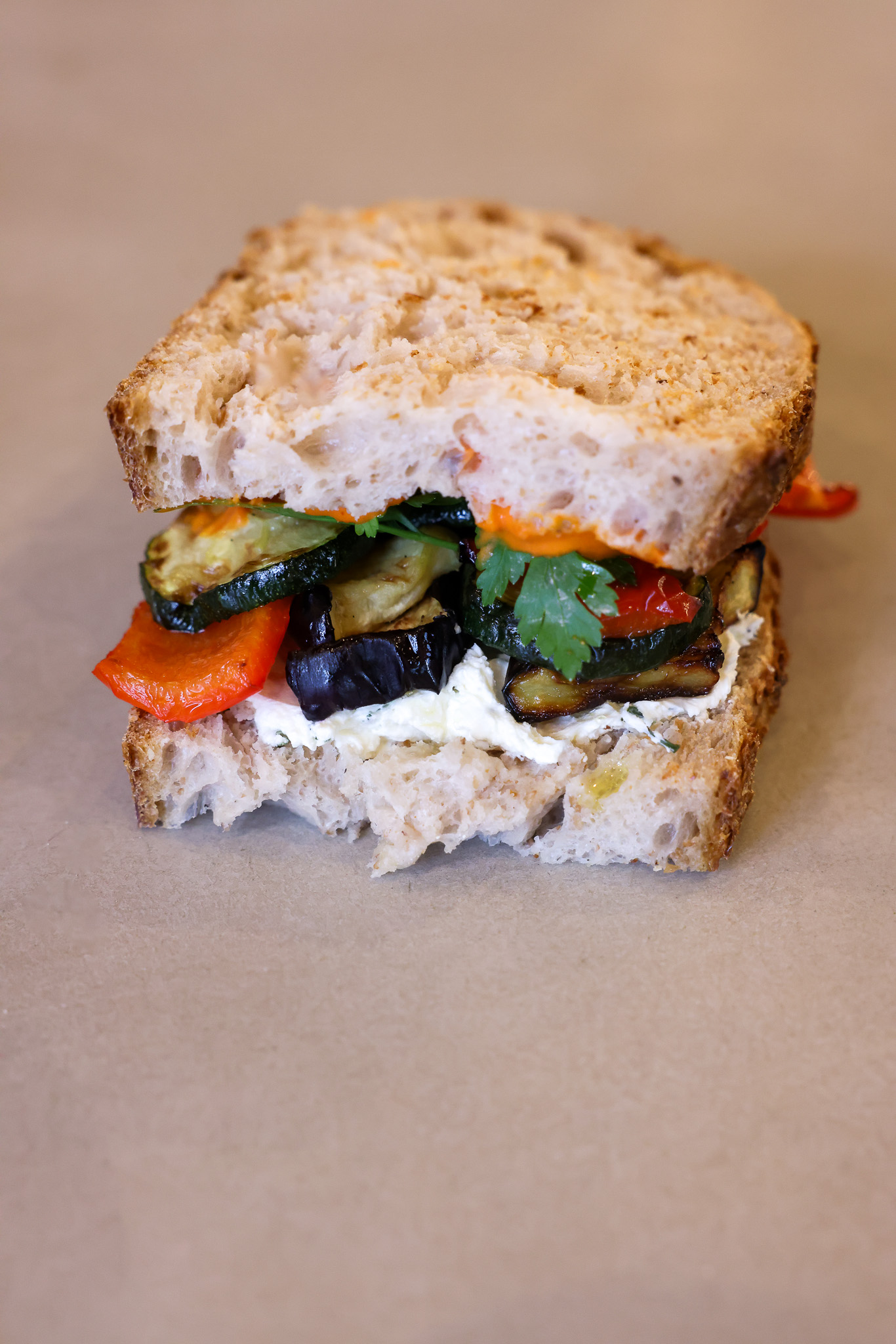 Kanapka z naszego klasyka (chleb pszenny na zakwasie, składniki: mąka pszenna (pszenica), woda, sól), twarożek chimichuri, grillowane warzywa (bakłażan, cukinia, papryka) sos z pieczonej papryki, natka pietruszki. Produkt zawiera gluten i może zawierać orzechy i sezam.
