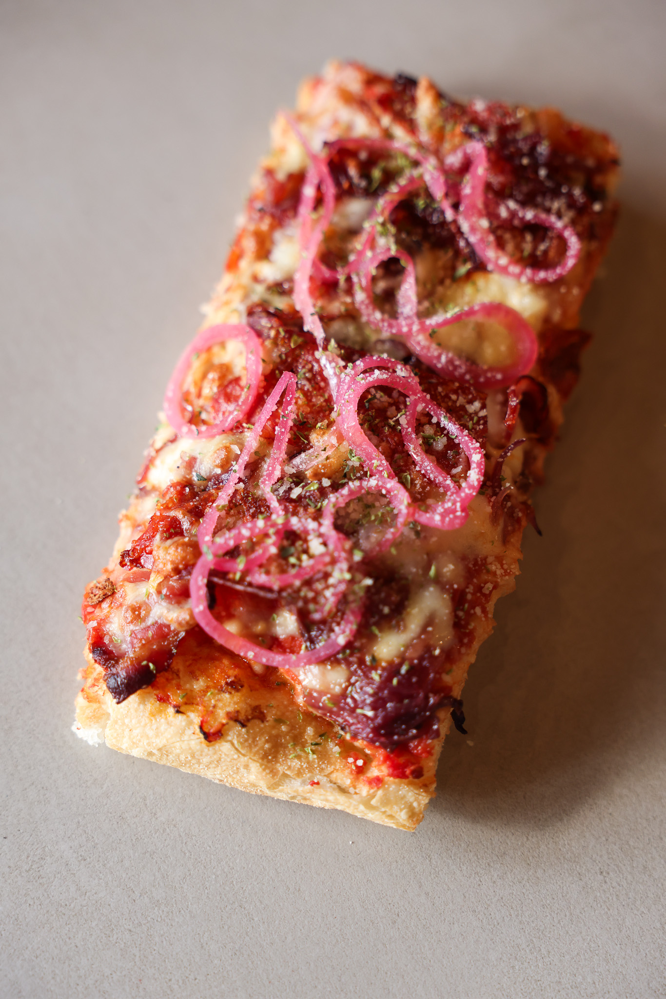 Focaccia sezonowa mięsna - Sos pomidoeowy, bekon, chutney cebula czerwona, spinatta napoli, scamorza affumicata, cebula piklowana, oregano.